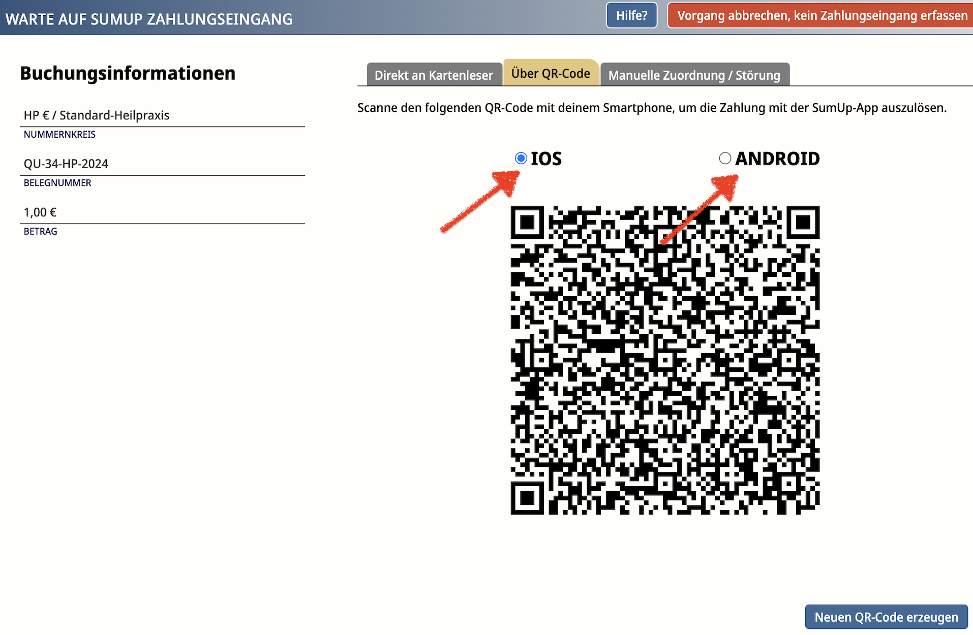 Scanne den QR-Code noch einmal oder lass ihn neu generieren (klicke dazu nochmal auf "offenen Betrag übernehmen"und dann auf "EC", und der QR-Code erscheint)!