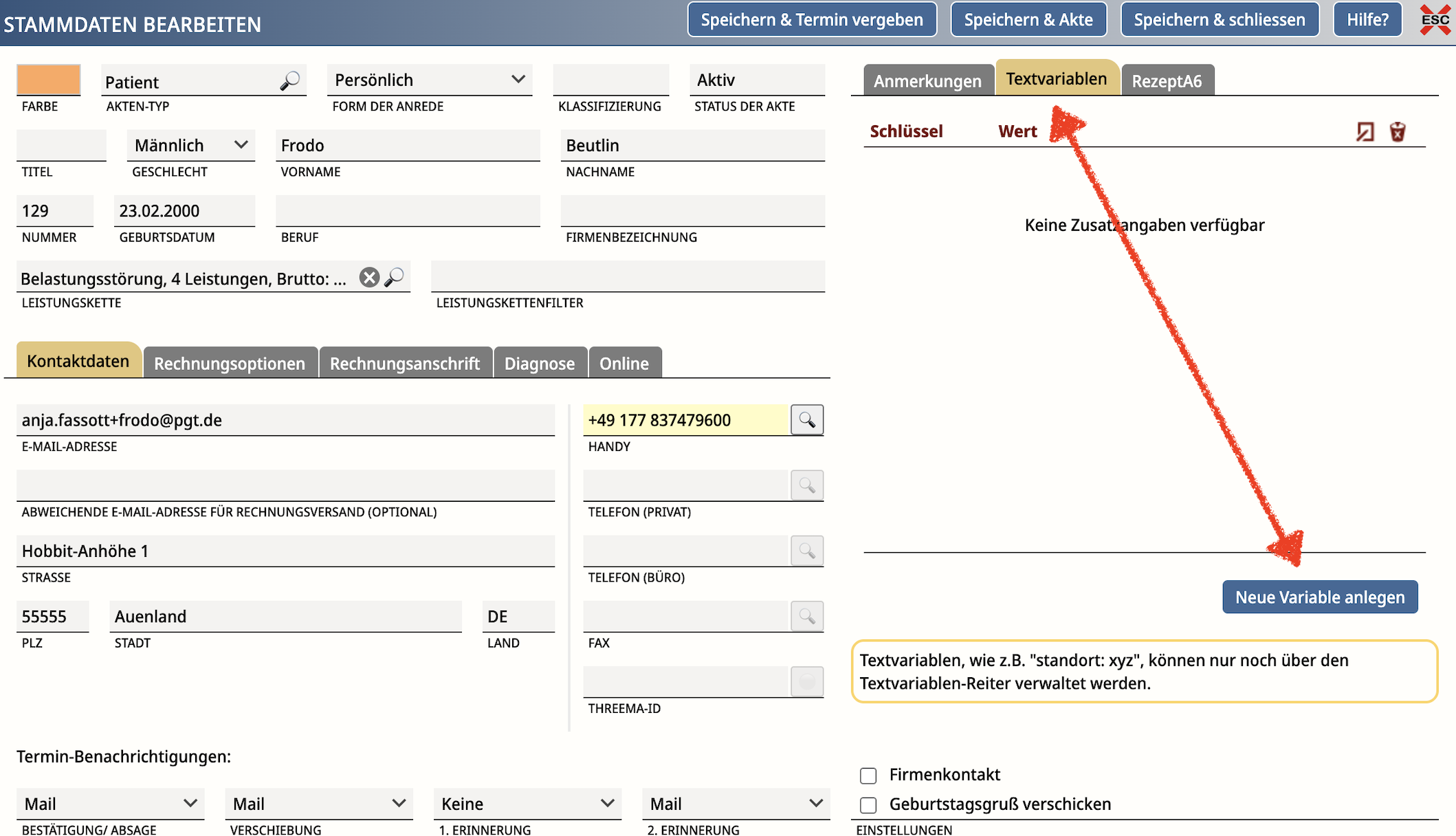 Erstelle in den Stammdaten der Akte auf der rechten Seite im Reiter Textvariablen eine neue Variable: