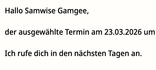Du möchtest bestimmte Infos nur mitschicken, wenn ein Termin eine bestimmte Bezeichnung hat? Auch das geht. Es ist zum Beispiel praktisch, wenn du unterschiedliche Hinweise für bestimmte Behandlungen geben willst oder Klientys mit Erstterminen anders ansprechen möchtest als solche mit Folgeterminen.