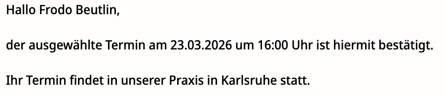 Der Text ("- Unterlagen für den Termin zu übermitteln") wird in einer Terminbestätigung automatisch nur dann angezeigt, wenn das Hochladen von Unterlagen in einem konkreten Fall erlaubt ist.