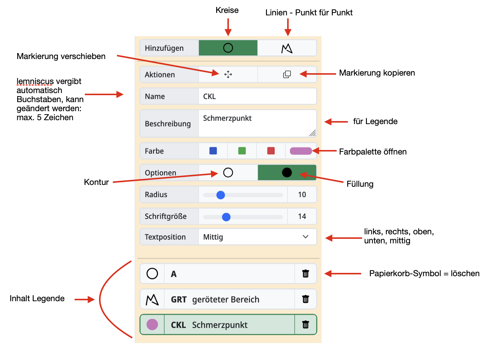 Alle diese Optionen stehen sowohl für Kreise als auch für Linien zur Verfügung. Die Textposition bezieht sich nur auf den Markierungs-Namen im Kreis bzw. an der Linie. -