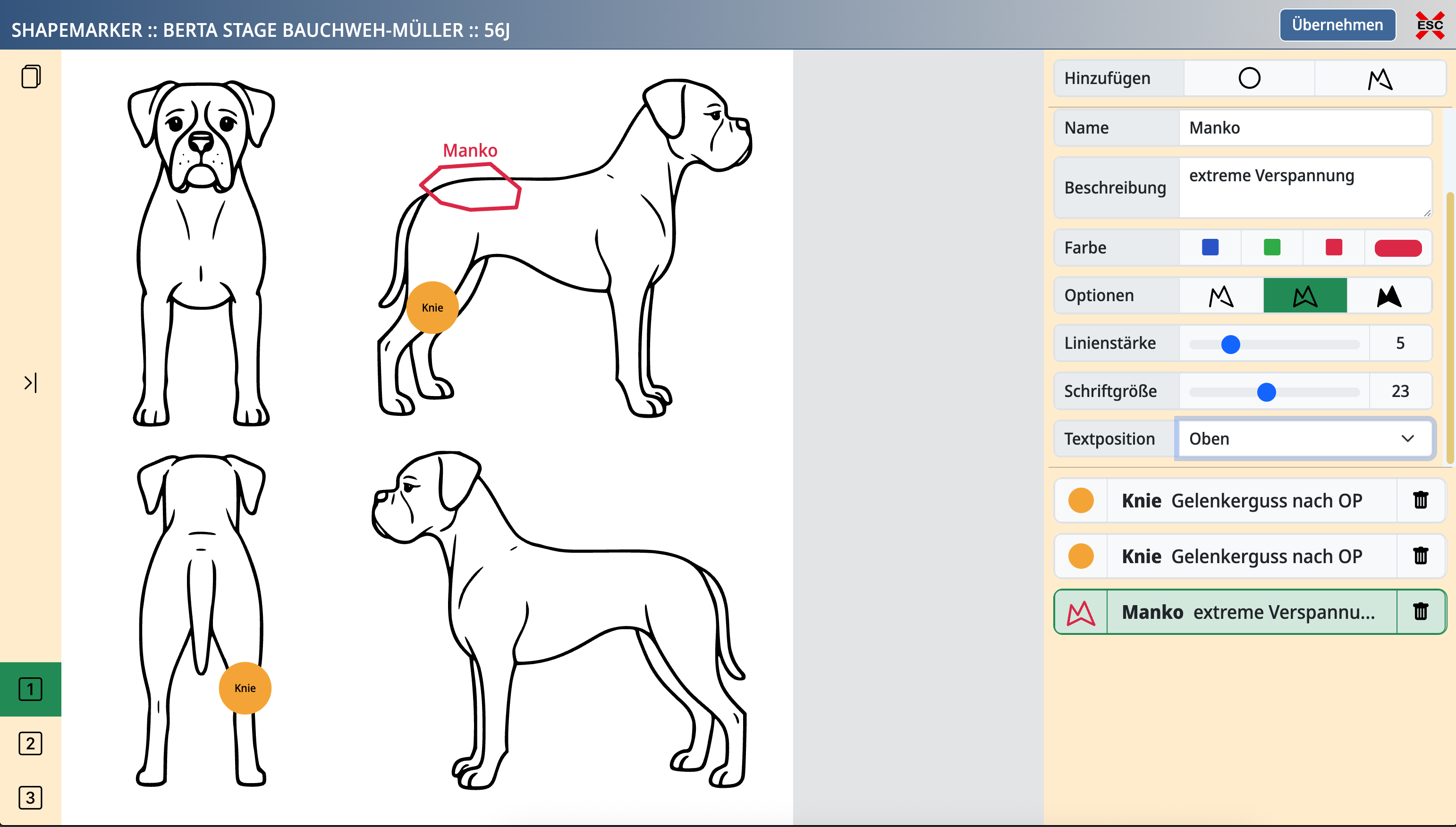 Du kannst beliebig viele Markierungen hinzufügen und so z. B. Schmerzregionen punktgenau bezeichnen.
