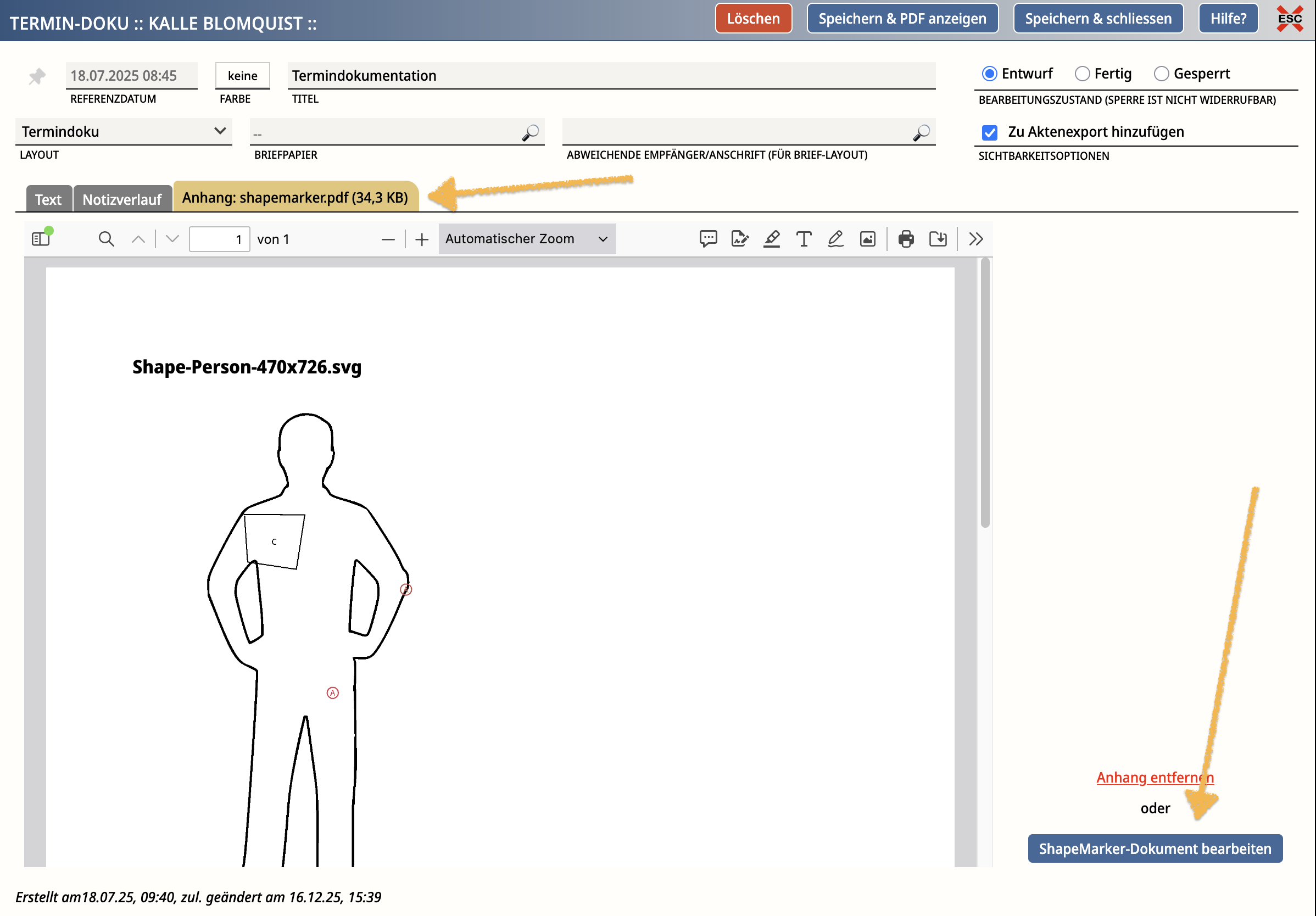 Hinweis: Pro Notiz oder Termindokumentation kannst du immer nur einen Anhang hinzufügen - das heißt, entweder ein ShapeMarker-Dokument oder einen anderen Dateianhang.
