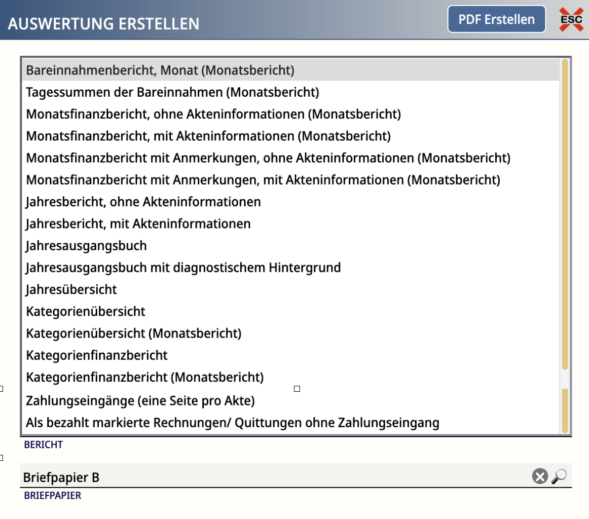PDF und Briefpapier: Die PDFs aus Auswertungen nutzen automatisch das Briefpapier, das du für Berichte freigegeben hast. Hinweis: In den Briefpapier-Einstellungen heißt es "für Berichte nutzen". Damit sind auch die Auswertungen in den Finanzen gemeint.
