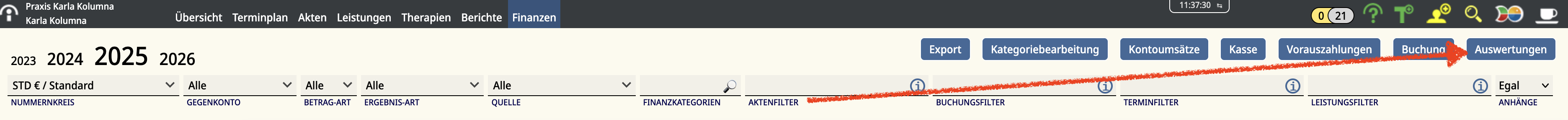 Vorher filtern: Nutze die Filterfunktionen in Finanzen (z. B. Aktenfilter, Jahr, Gegenkonto), um die Auswertung auf den gewünschten Bereich einzugrenzen.
