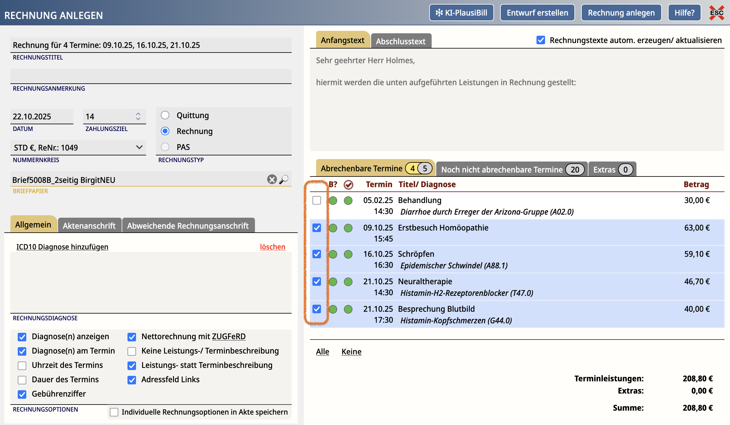 Setze Häkchen bei den Terminen, die du gemeinsam abrechnen möchtest - also einfach in die Kästchen links neben dem Termin klicken. - Rechnung erstellen