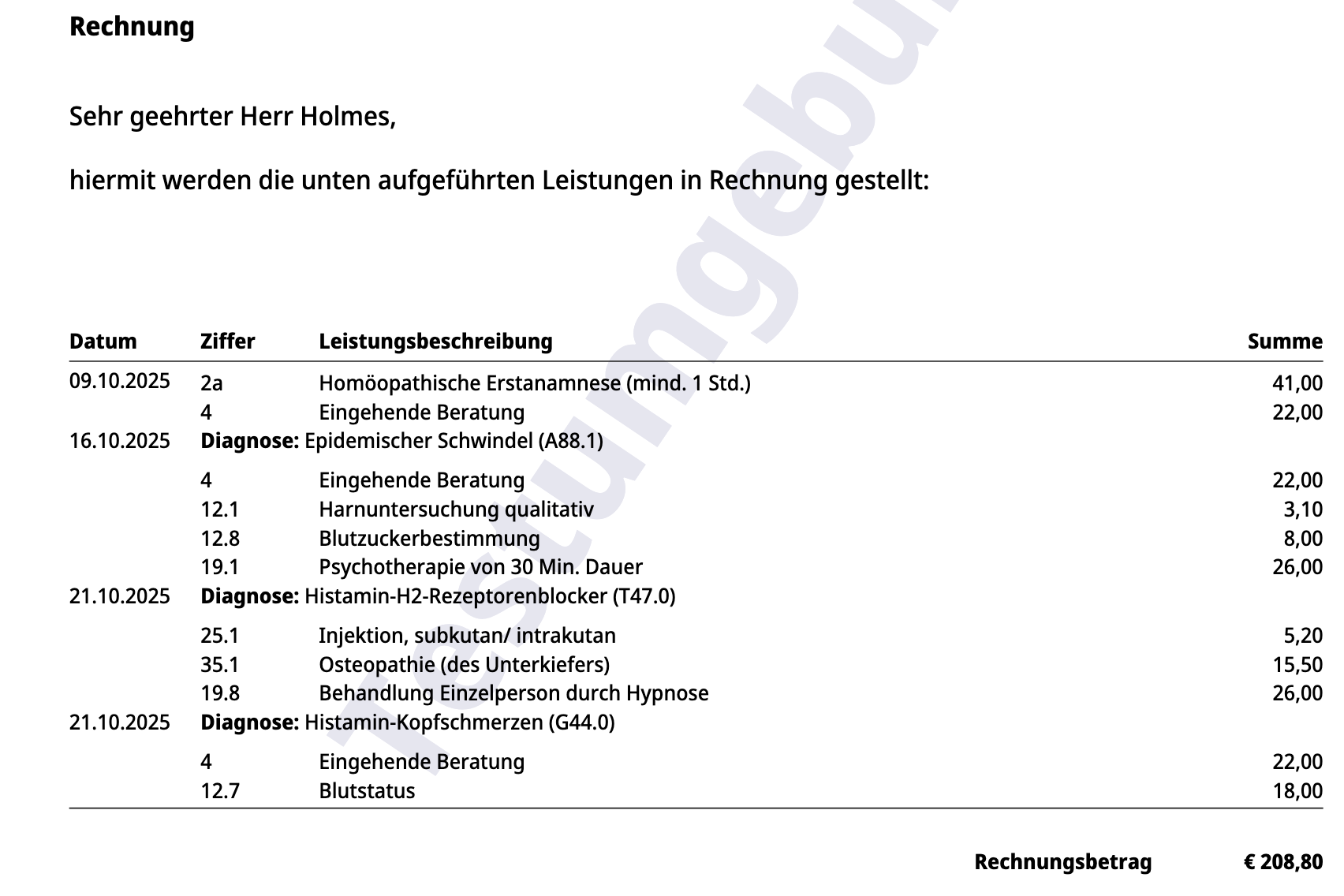 In der fertigen Rechnung werden die Termine mit ihren Leistungen untereinander aufgelistet. So sieht Klienty genau, welche Leistungen für welche Termine abgerechnet wurden.