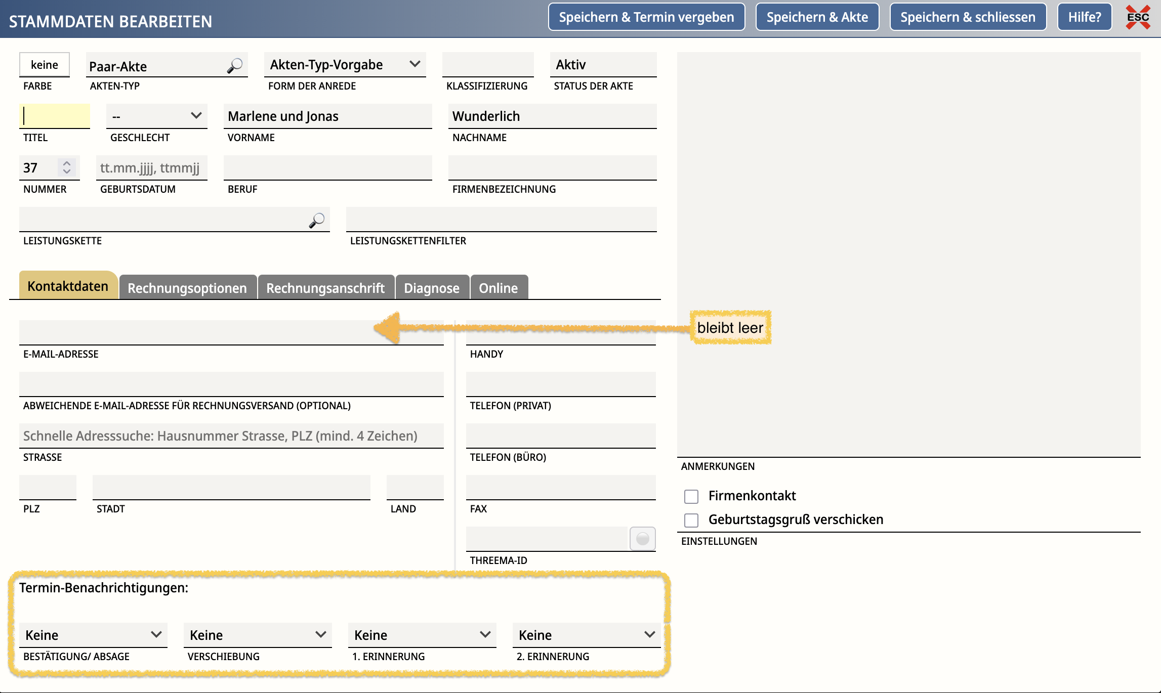 - Prüfe, ob E-Mail-Adressen bzw. Telefonnummern sinnvoll verteilt sind (z. B. nicht die selbe Handynummer in beiden Akten, wenn du SMS nutzen willst).