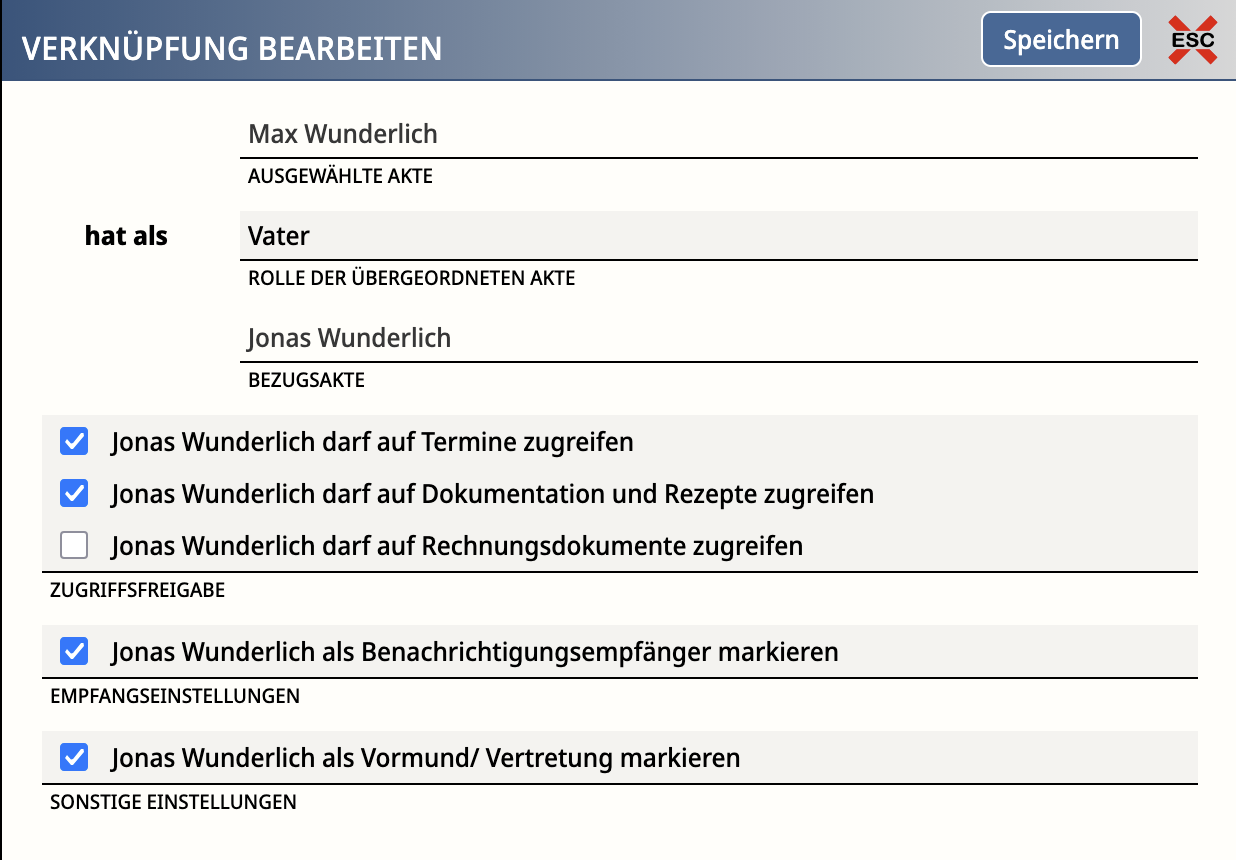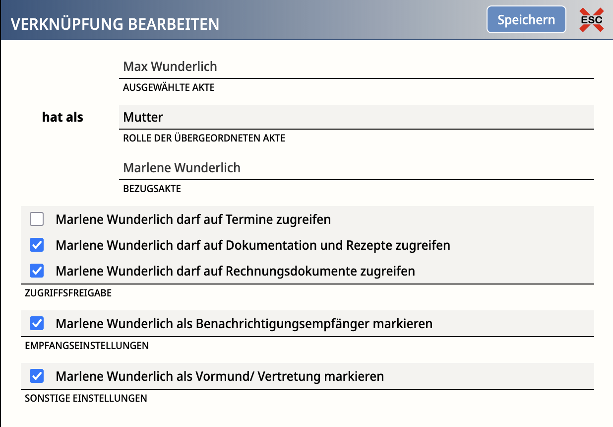 In Max’ und Emils Akte werden je zwei Verknüpfungen mit den passenden Berechtigungen für die Eltern gesetzt. Im Beispiel bearbeiten wir Max - für Emil gilt das Gleiche.