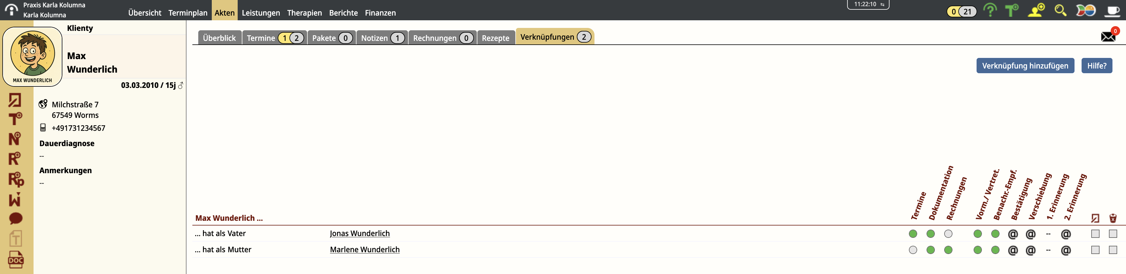 So sieht es nach dem Speichern im Reiter "Verknüpfungen" in Max`Akte aus: