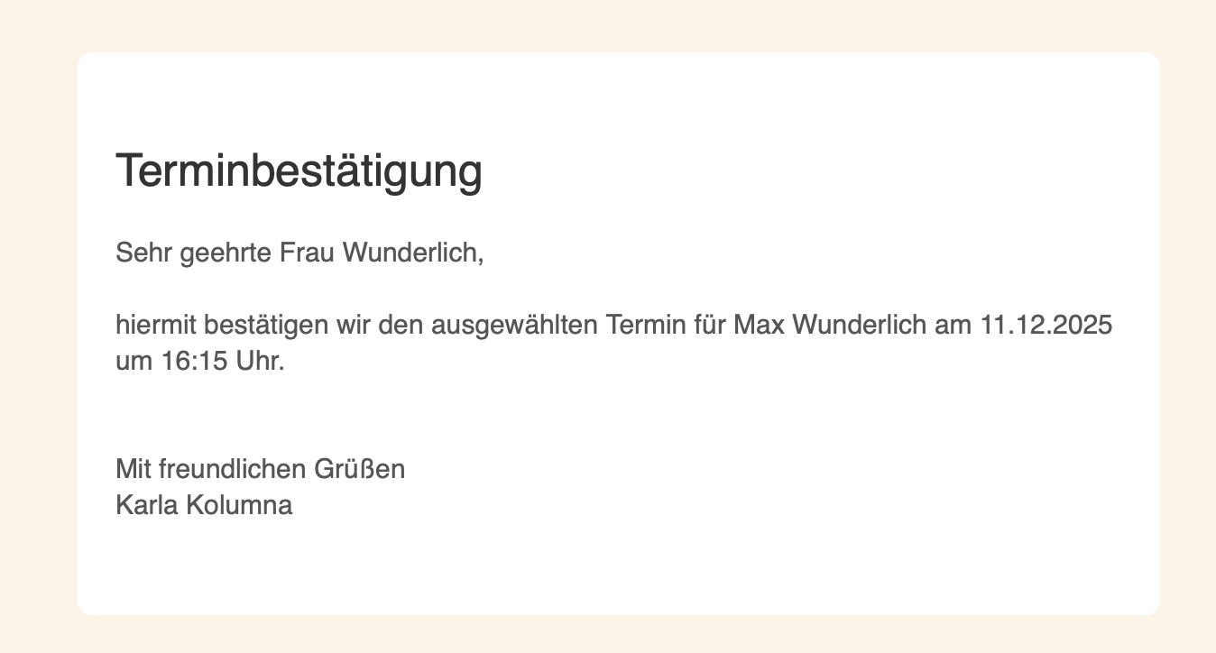 Damit Terminbenachrichtigungen, Terminzettel, Online-Terminvergabe und Rechnungen zuverlässig und im richtigen Ton bei den richtigen Personen ankommen, brauchst du vor allem