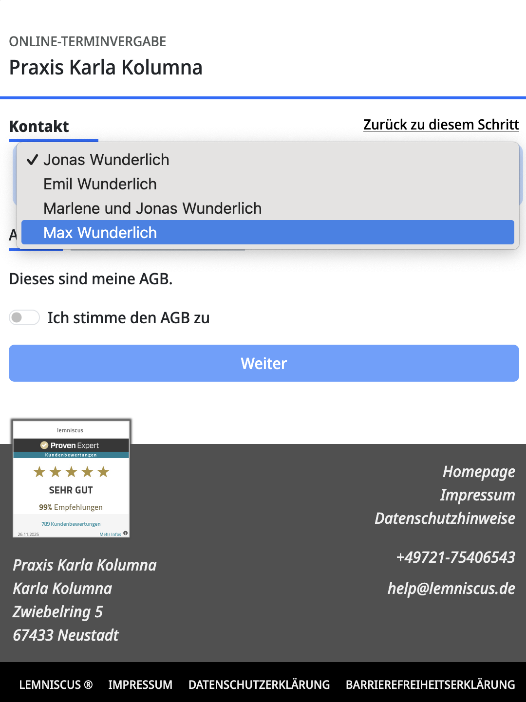 - Info: Die Praxis Karla Kolumna verschickt grundsätzlich keine 1. Erinnerung.
