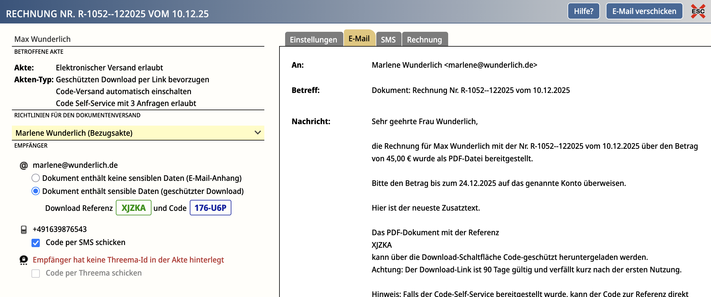 Nach dem Erstellen der Rechnung stellen wir ihr den entsprechenden Link per E-Mail und SMS zur Verfügung (Auswahlfeld: "Empfänger"):