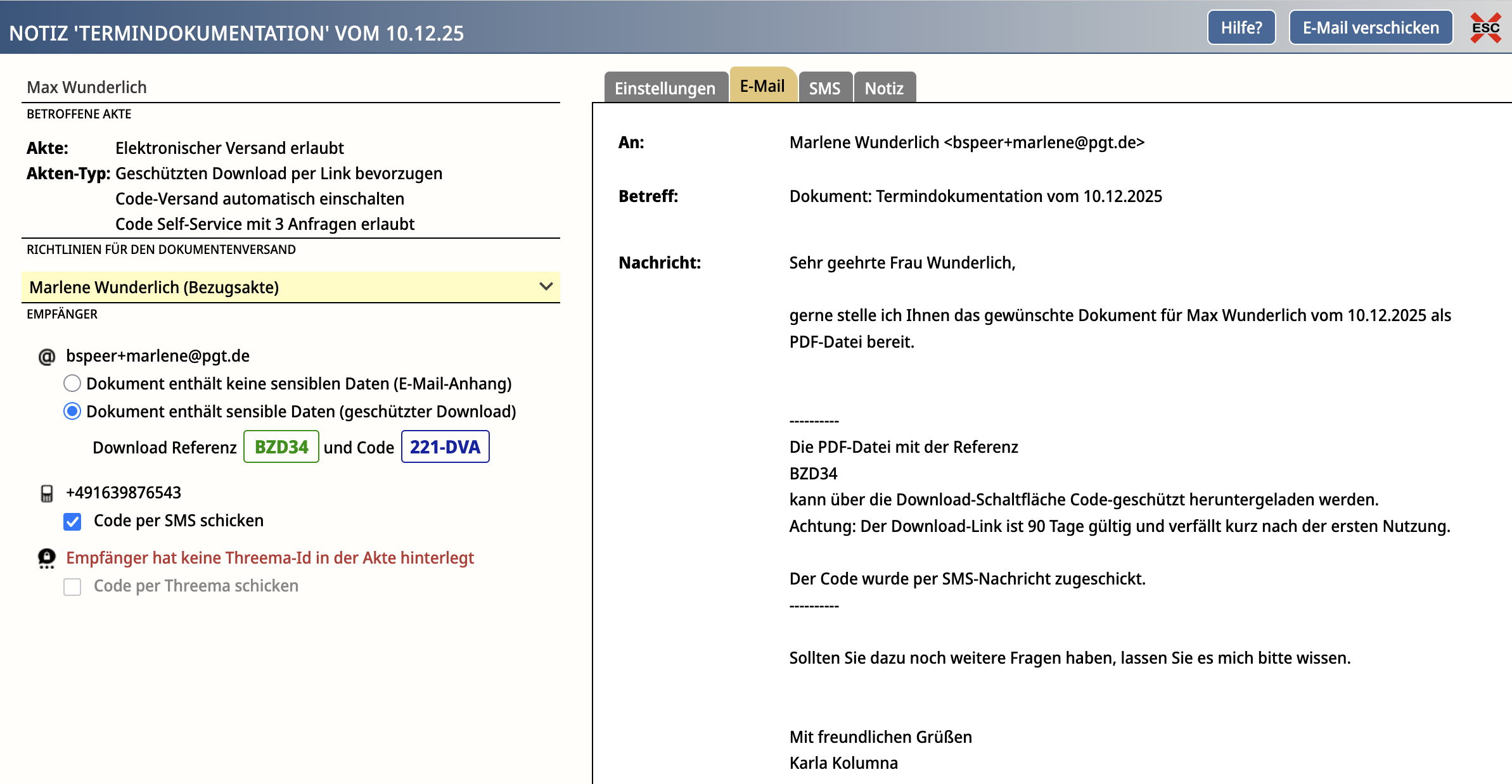 - Max erhält keine weiteren Benachrichtigungen außer der 2. Erinnerung per SMS (wie in seiner Akte eingestellt).
