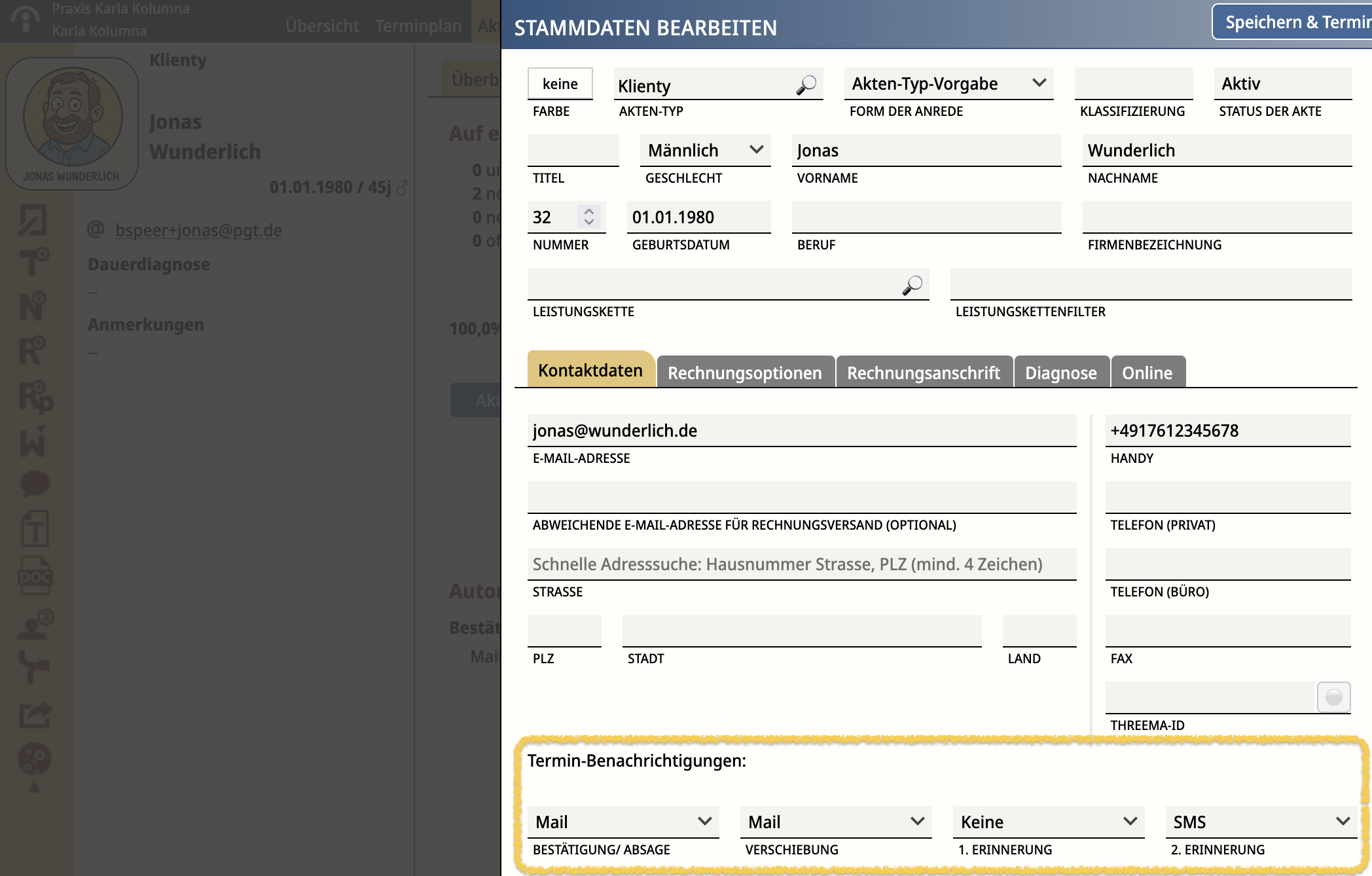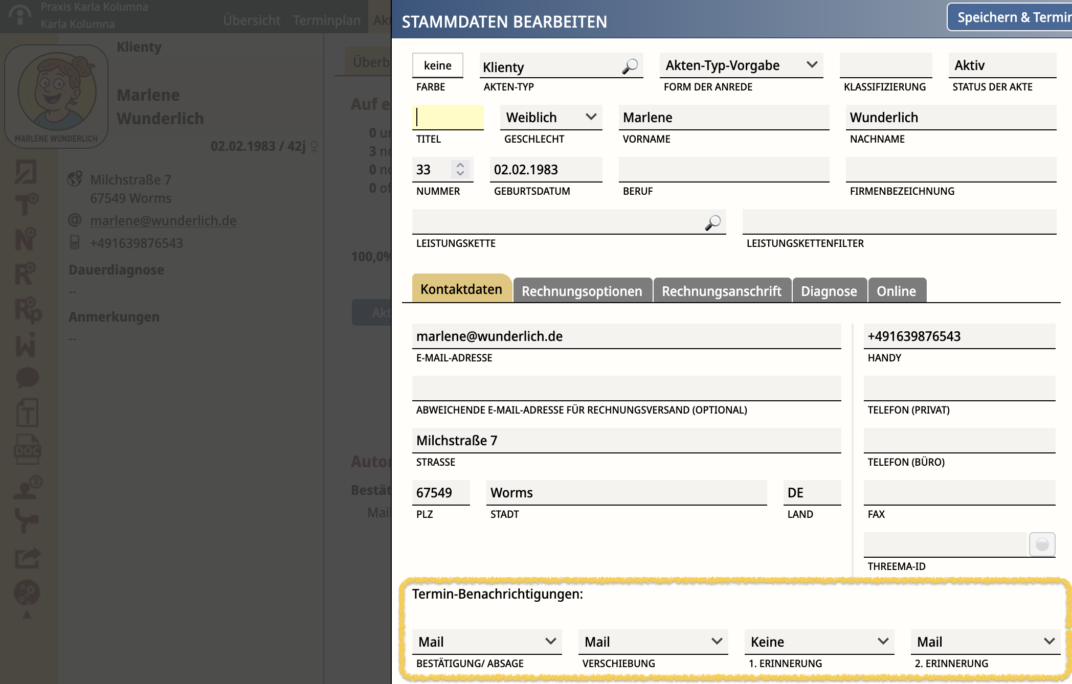 Bestätigung: an/Mail Verschiebung: an/Mail Erinnerung 1: keine Erinnerung 2: an/SMS |