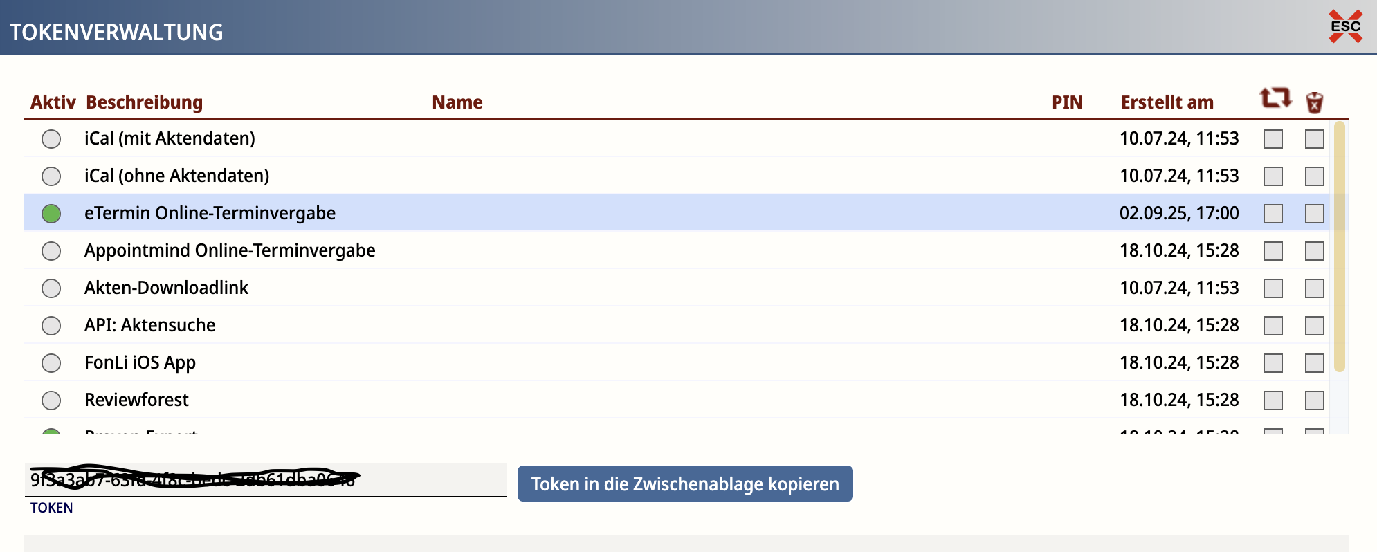 • Kopiere den Token und trage ihn in deinem eTermin-Account laut deren Anleitung ein.