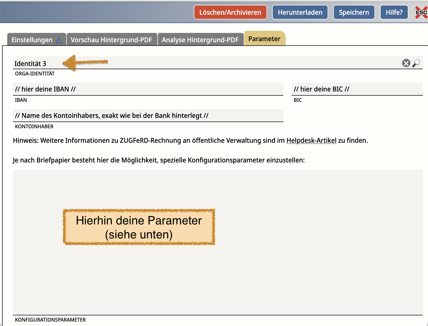 - Ergänze im Feld "Konfigurationsparameter" die notwendigen Angaben. Die hier hinterlegte Anschrift wird für ein weiteres Blatt der Tarif-590-Rechnung benutzt.