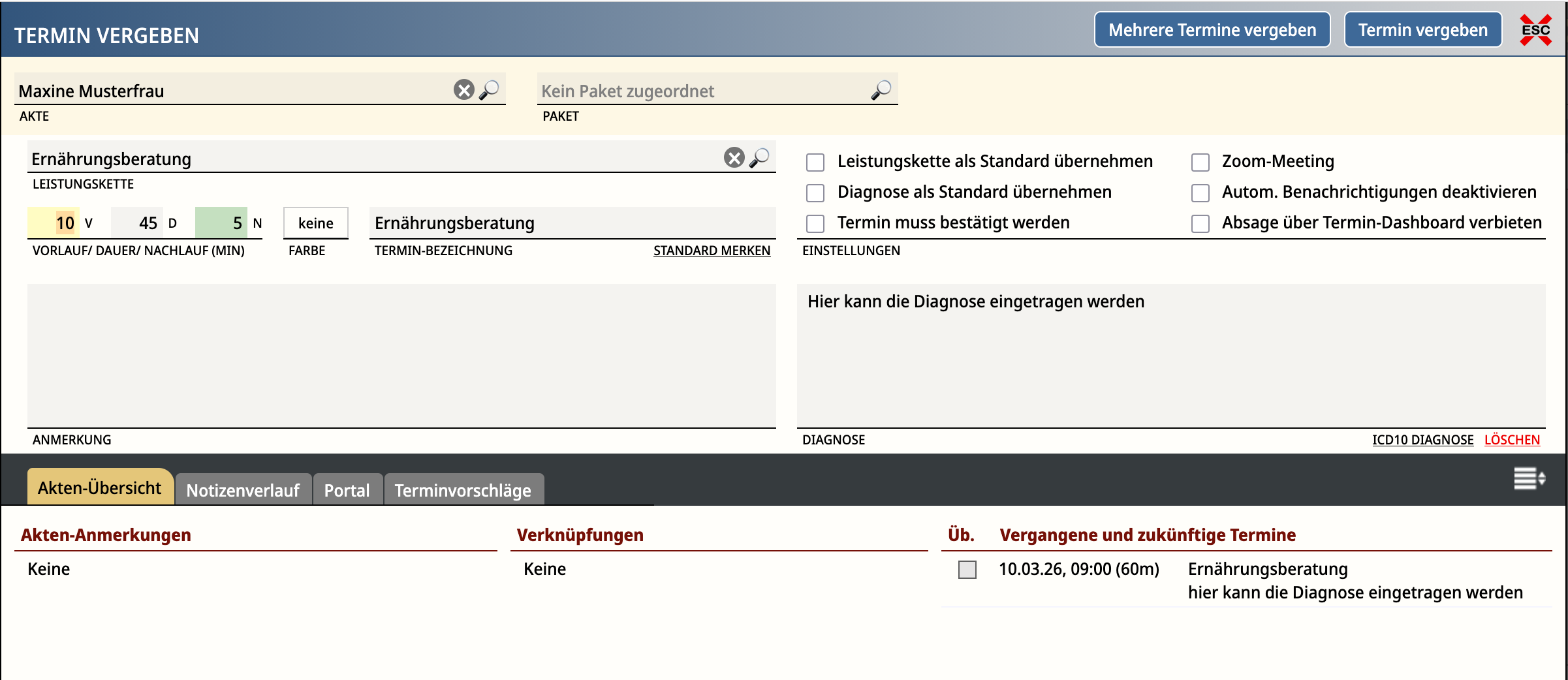 Unten rechts kannst du Diagnosen auswählen oder Dauerdiagnosen einfügen.