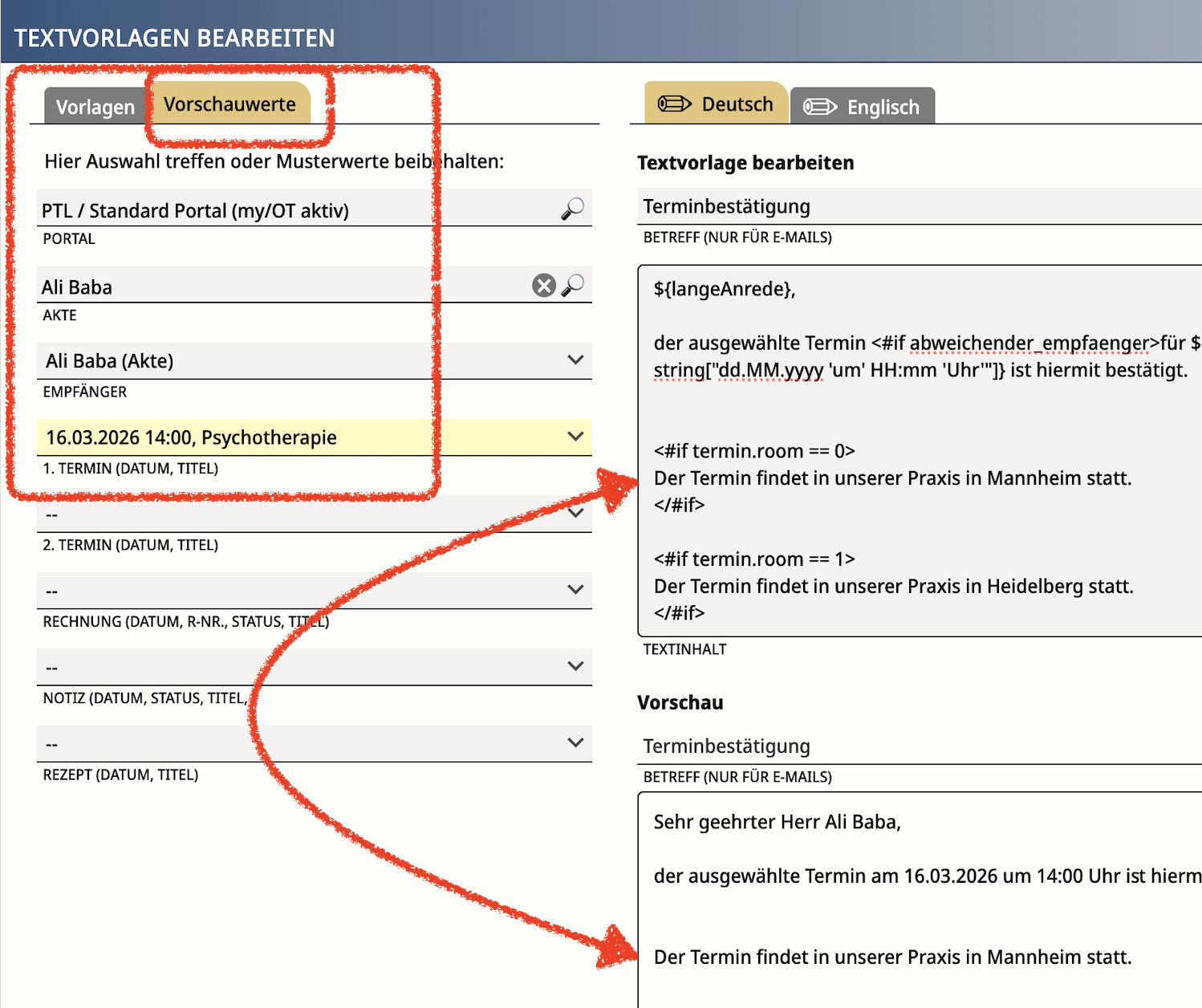 Die Änderungen siehst du dann auch in der Vorschau. Speichere deine Änderungen über "Änderungen an Textvorlage speichern".