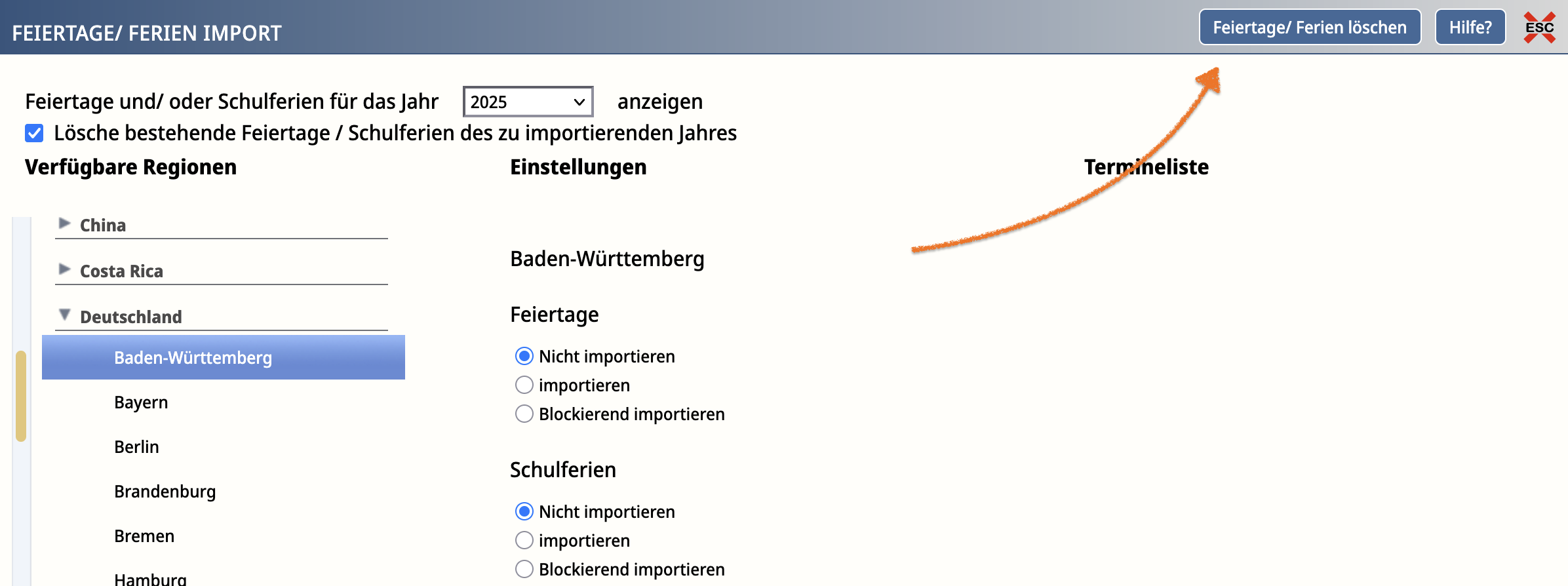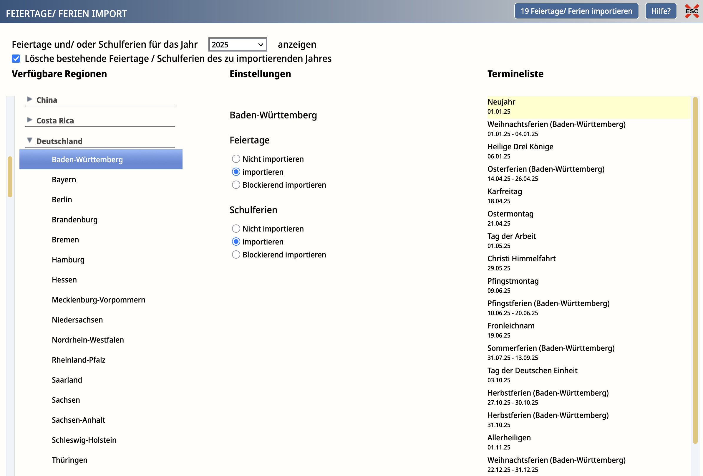 Wählst du bei Feiertagen und bei Schulferien jeweils "Nicht importieren" aus, erscheint der Button "Feiertage/Ferien löschen".