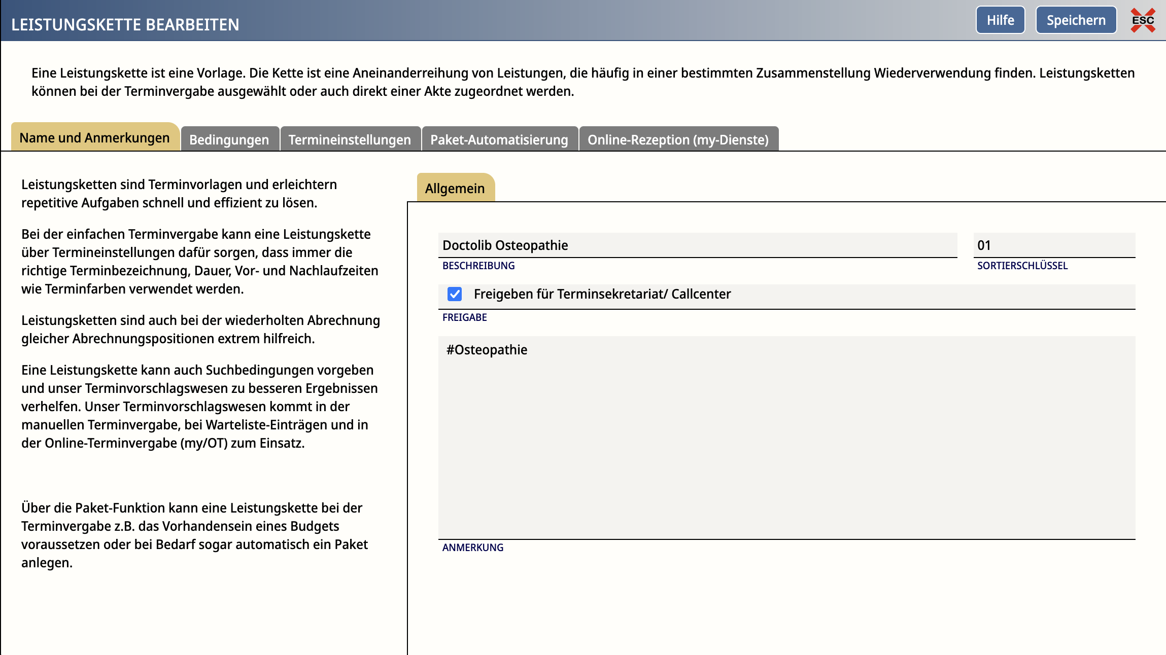 Im folgenden Beispiel würde die Leistungskette für einen Besuchsgrund verwendet werden, welchem die Synchronisationskennung "#Osteopathie" zugeordnet ist.